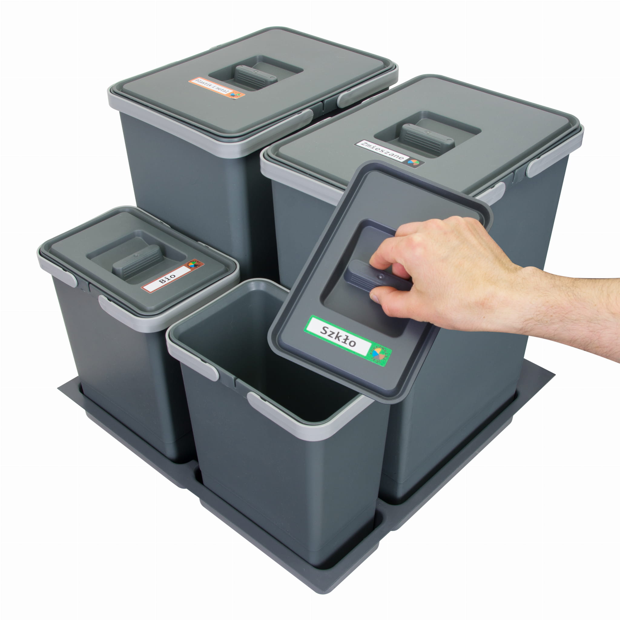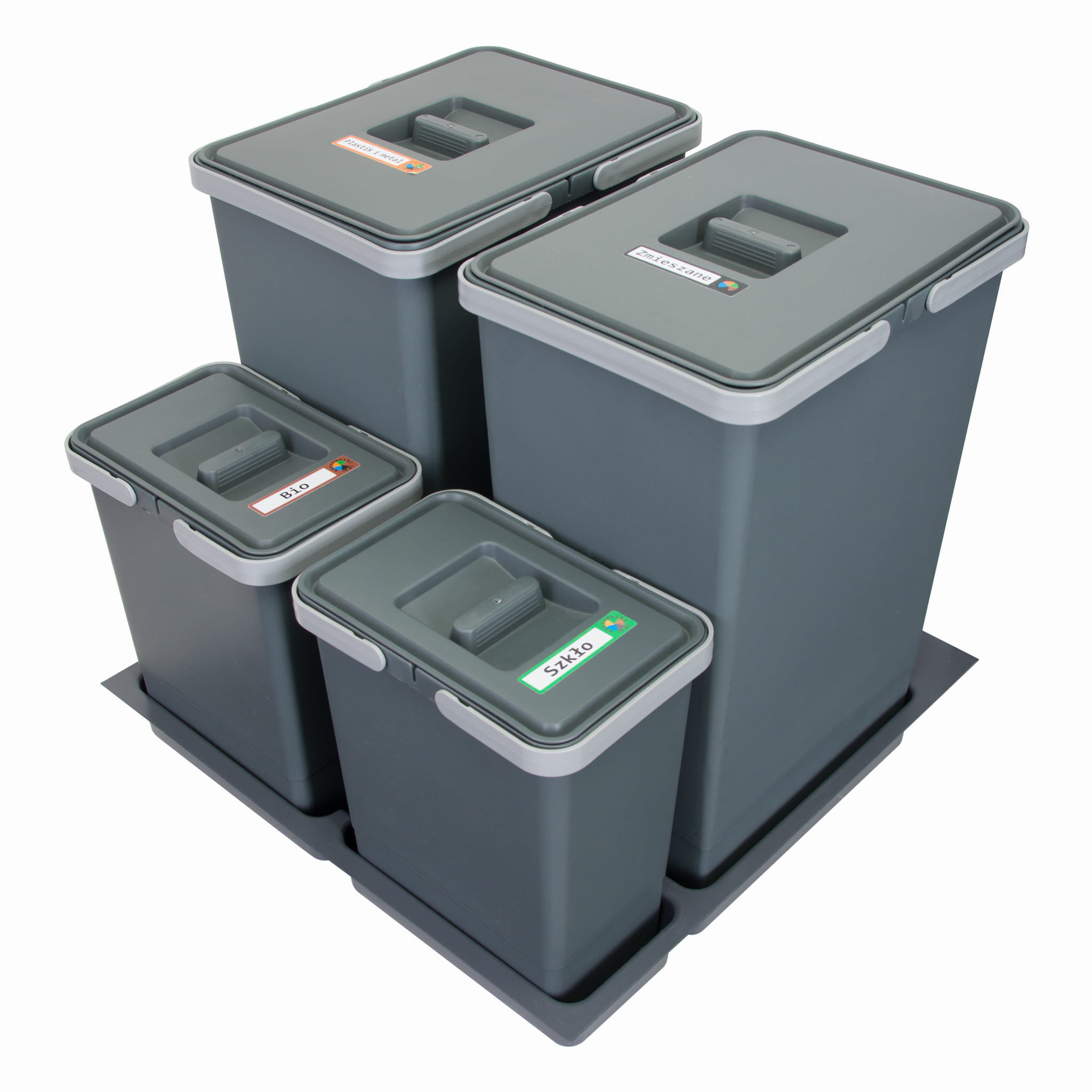 Sortownik śmieci FUTURE CONFIG 2x24 l + 2x7 l to kompaktowy zestaw koszy do mebli kuchennych dedykowany osobie poszukującej niestandardowych segregatorów odpadów. Pozwala on na komfortowe selekcjonowanie odpadów w szufladach szafek kuchennych o szerokości 60 cm.