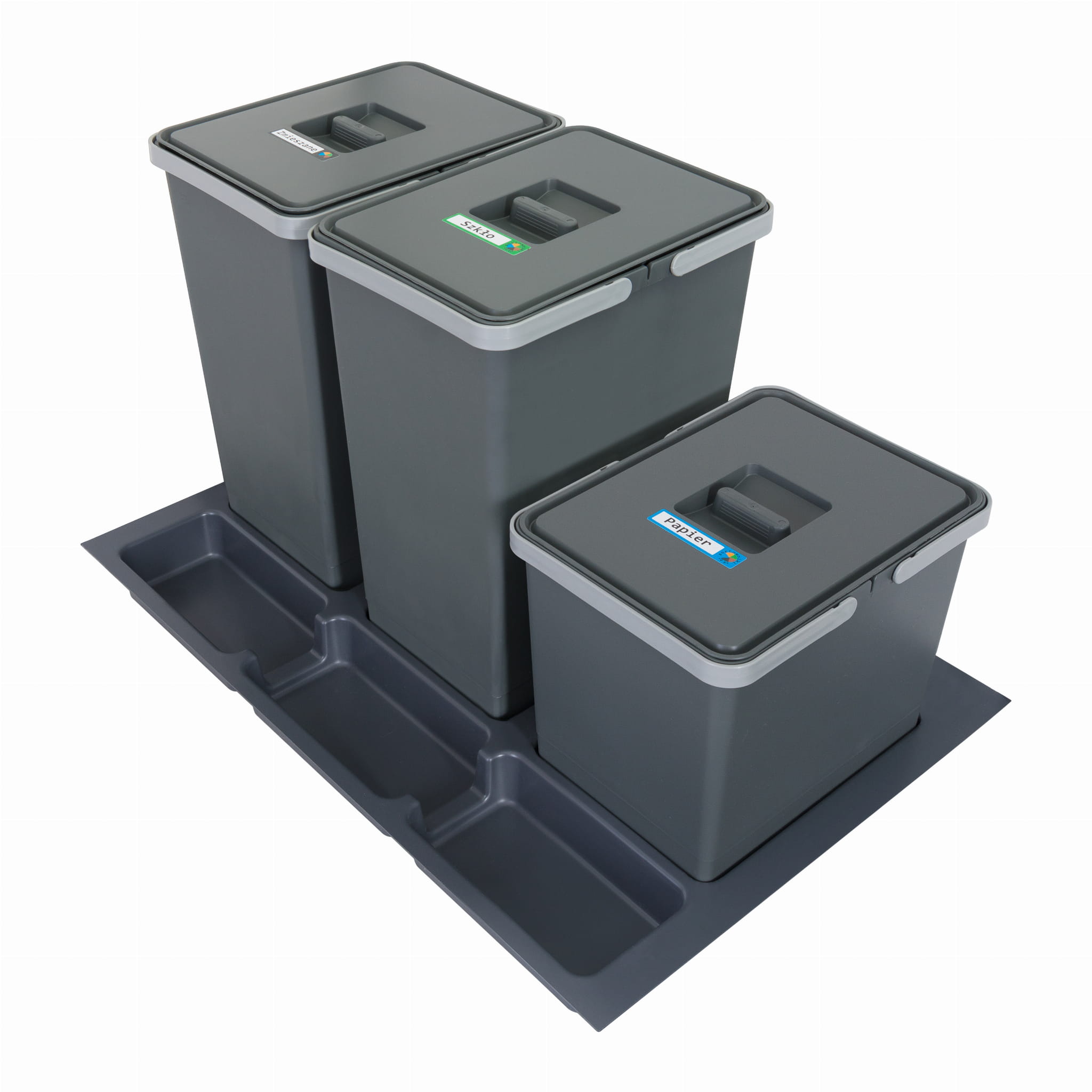 Składa się z trzech dużych koszy o pojemnościach – 2 x 24 l oraz 1 x 15 l stabilnie ustawionych na wytrzymałej tacce, wzbogaconej w trzy wbudowane koszyki na gadżety kuchenne.