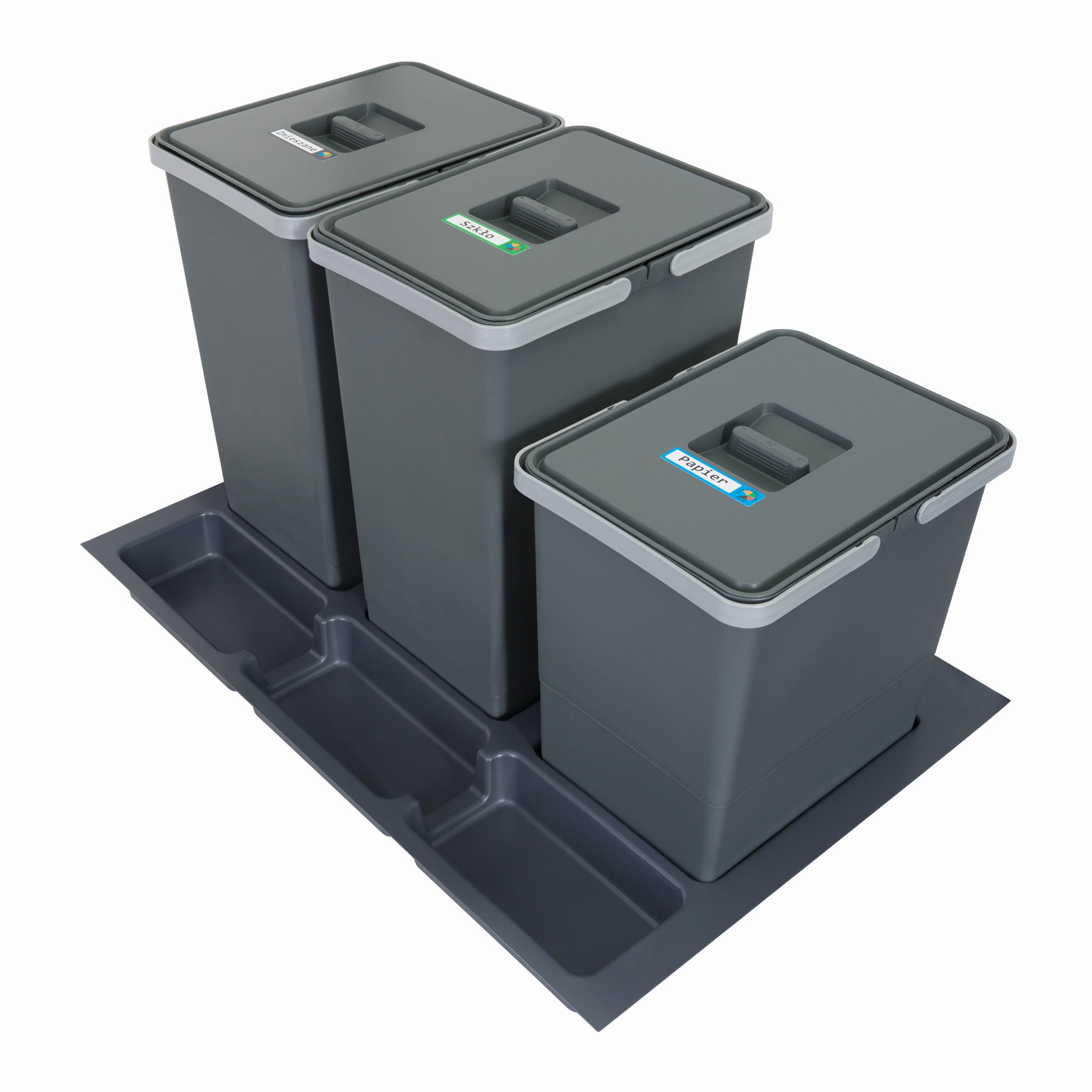 Na zestaw składają się trzy duże kosze o pojemnościach – 2 x 24 l oraz 1 x 18 l stabilnie umieszczone na wytrzymałej tacce, wzbogaconej w trzy wbudowane koszyki na gadżety kuchenne.