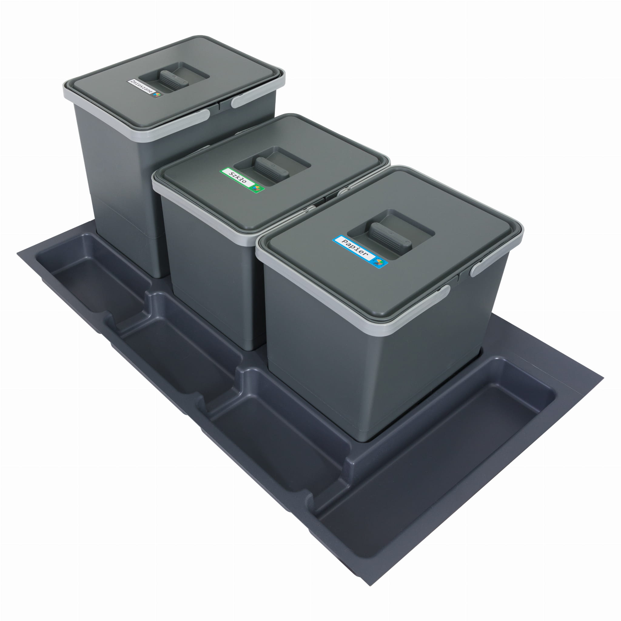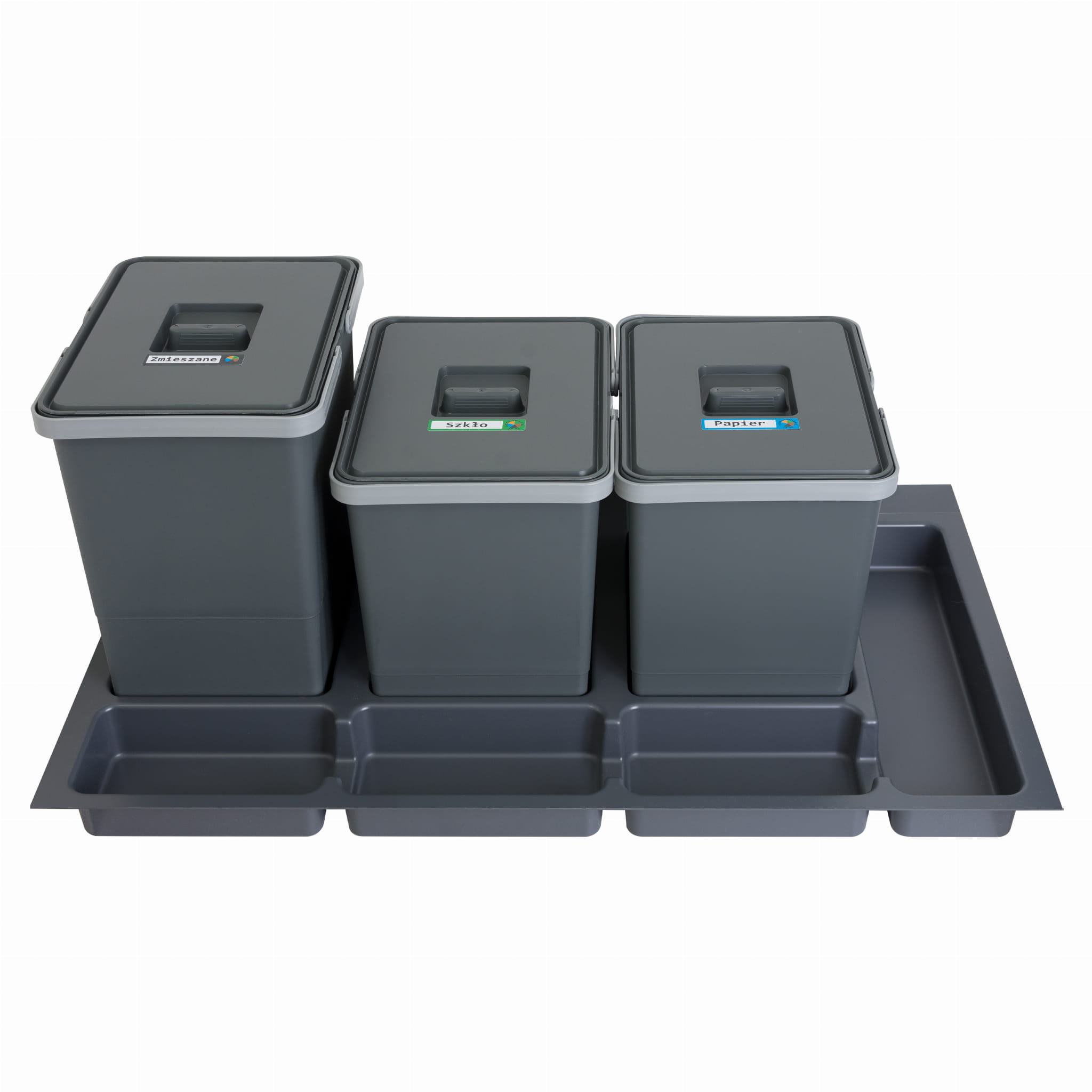 Sortownik śmieci FUTURE CONFIG 2x15 l + 1x18 l to produkt szczególnie wybierany przez osoby poszukujące funkcjonalnych i łatwych w użytkowaniu segregatorów odpadów. Dedykowany jest szufladom szafek kuchennych o szerokości 90 cm.