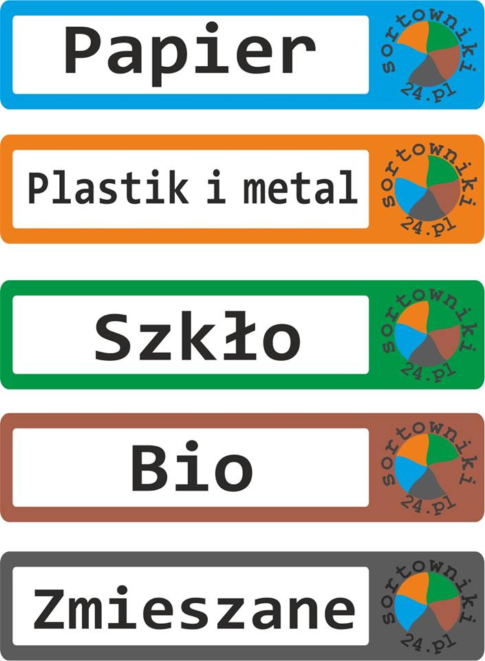 Do zestawu dodajemy zestaw naklejek pięciu frakcji (PAPIER, PLASTIK I METAL, SZKŁO, BIO, ZMIESZANE). Każda etykieta odkleja się oddzielnie i można umieścić ją na pojemnikach lub w miejscu przeznaczonym do segregacji.