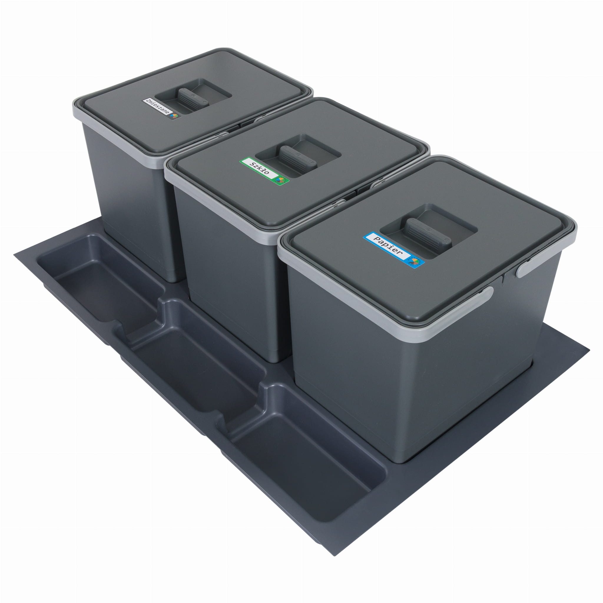 Składają się na niego trzy kosze na śmieci o pojemności 3 x 15 l stabilnie umieszczone na wytrzymałej tacce. Każdy z koszy wyposażony jest we własną pokrywę, uchwyty oraz nacięcia pozwalające na umieszczenie dwóch worków na śmieci. Podkładka natomiast wzbogacona jest w cztery podręczne koszyki przeznaczone na gadżety kuchenne.