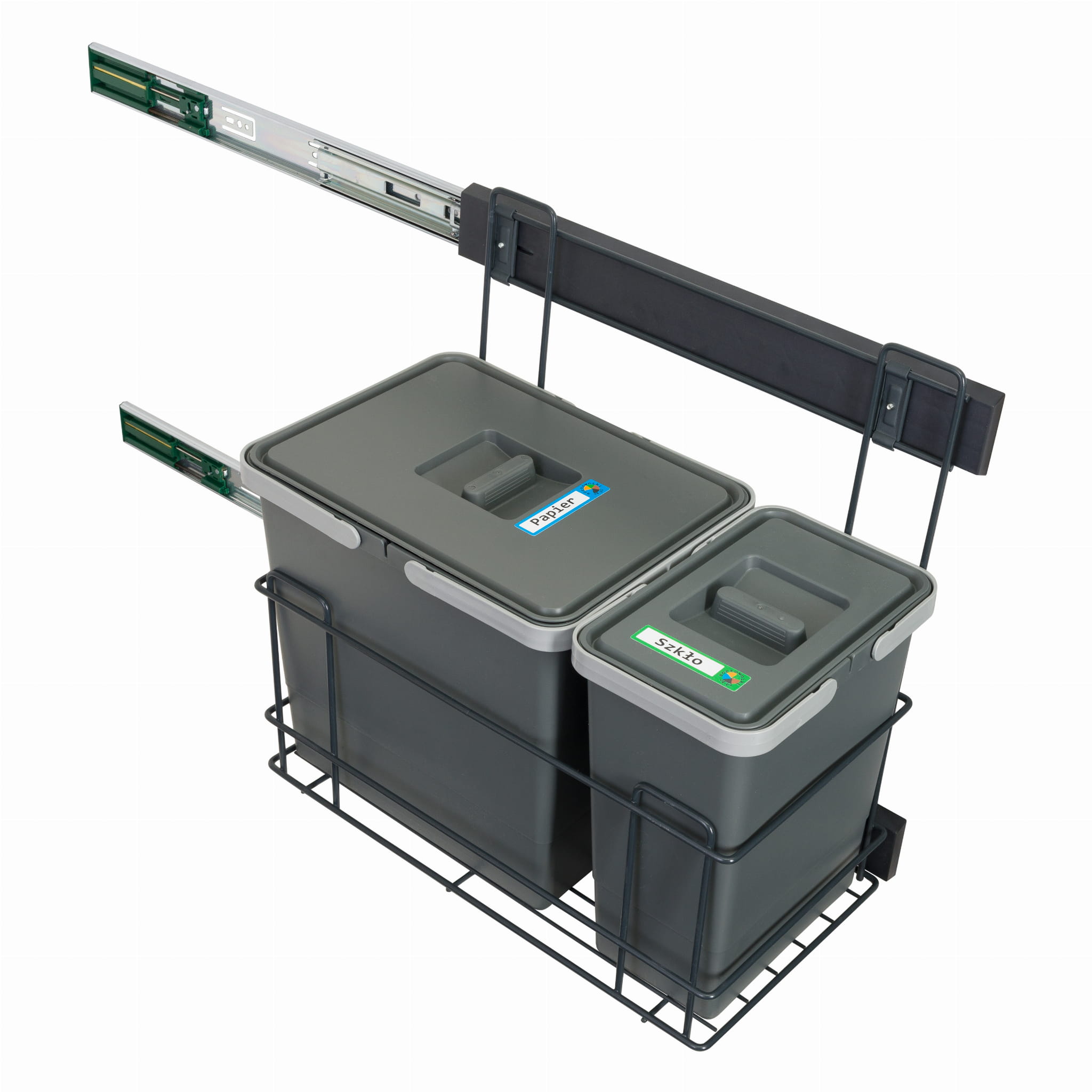 Zestaw składa się z dwóch koszy z pokrywami, stalowego stelaża, wysokiej jakości prowadnic z funkcją pełnego wysuwu i cichego domyku oraz kompletu mocowań.