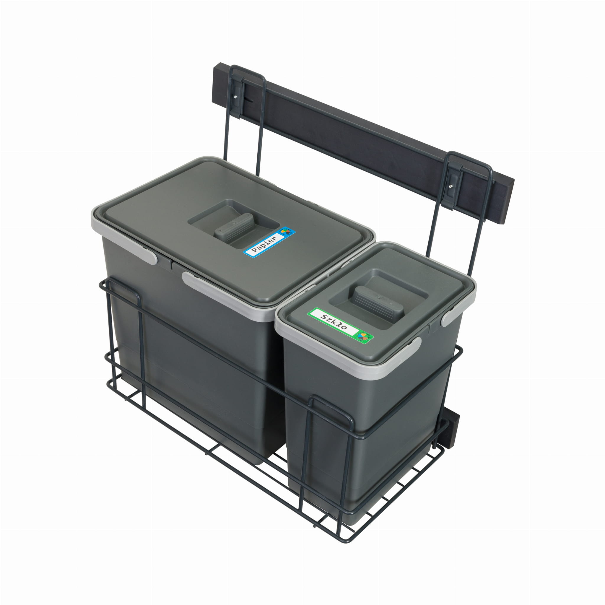 Segregator na śmieci dedykowany jest wąskim szafkom kuchennym o szerokości 30 cm z frontem na zawiasach. Idealnie funkcjonuje w szafkach zlewozmywakowych, gdzie nie koliduje z syfonem.