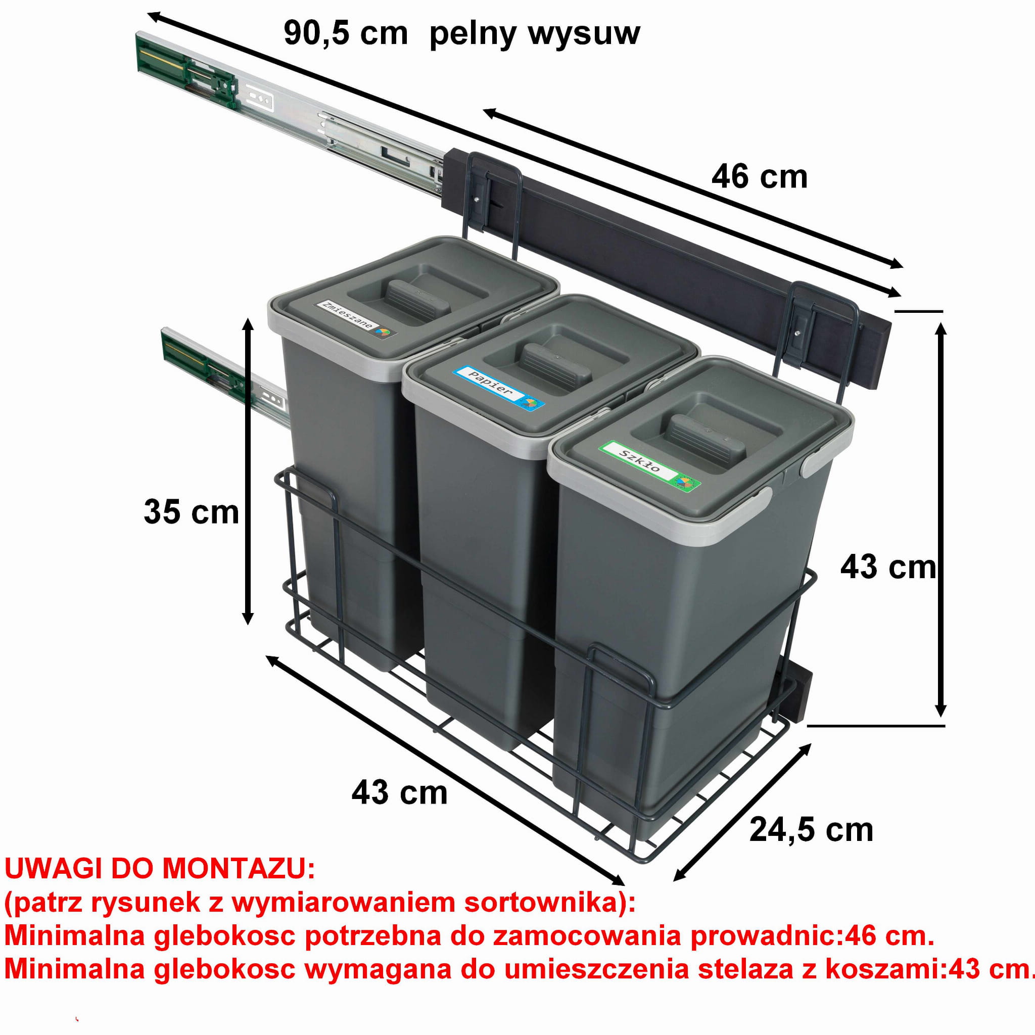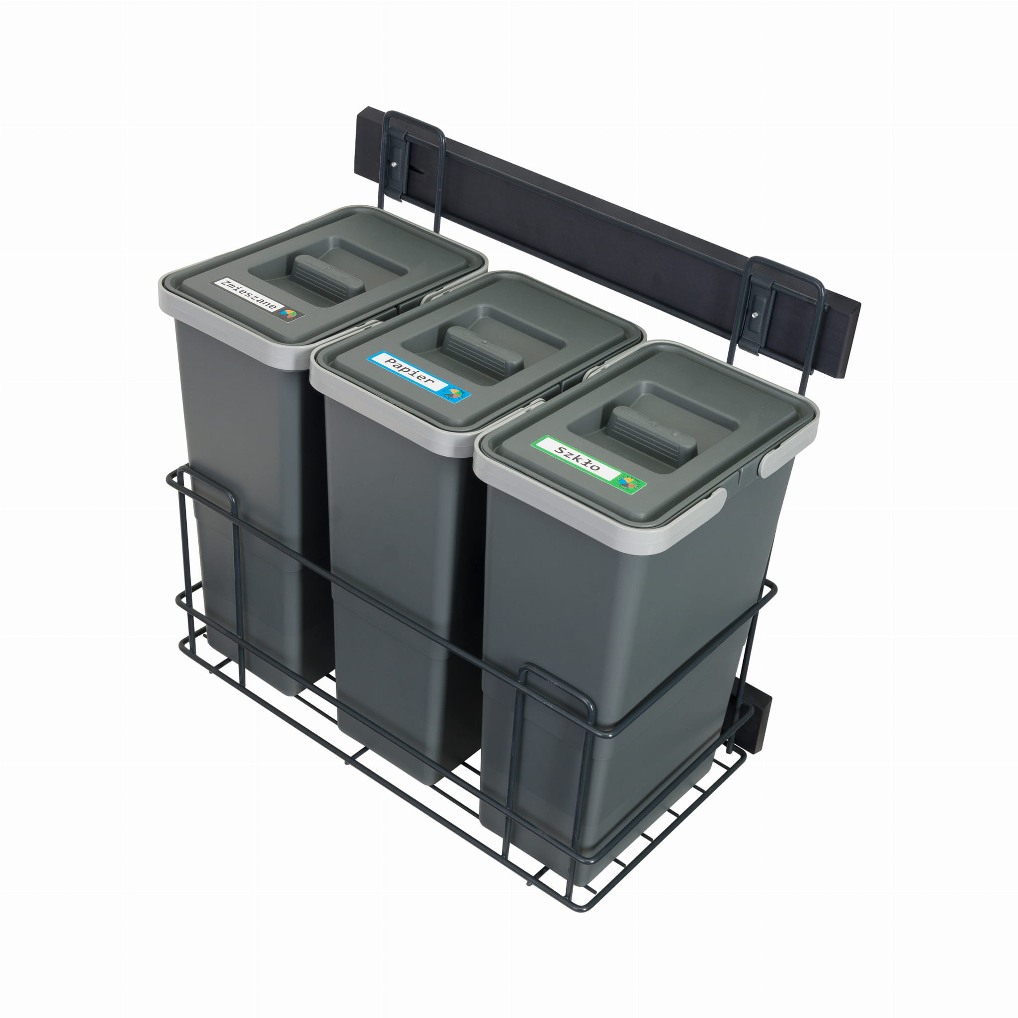 Produkt składa się z trzech koszy z pokrywami, stalowego stelaża, wysokiej jakości prowadnic z funkcją pełnego wysuwu i cichego domyku oraz kompletu mocowań.