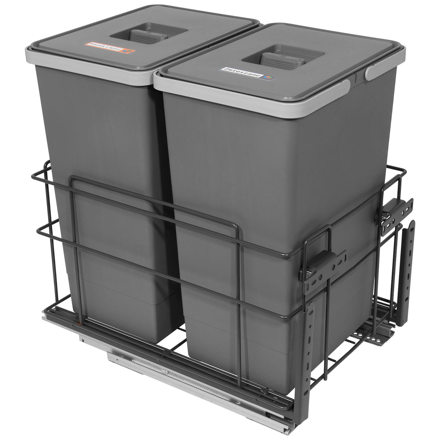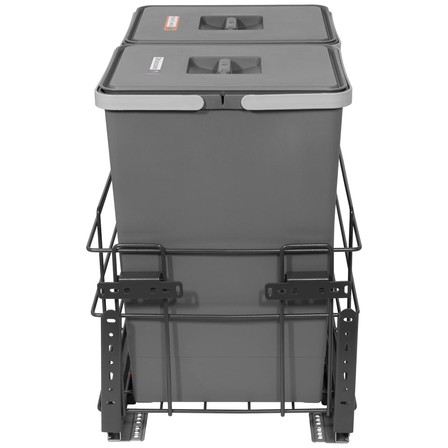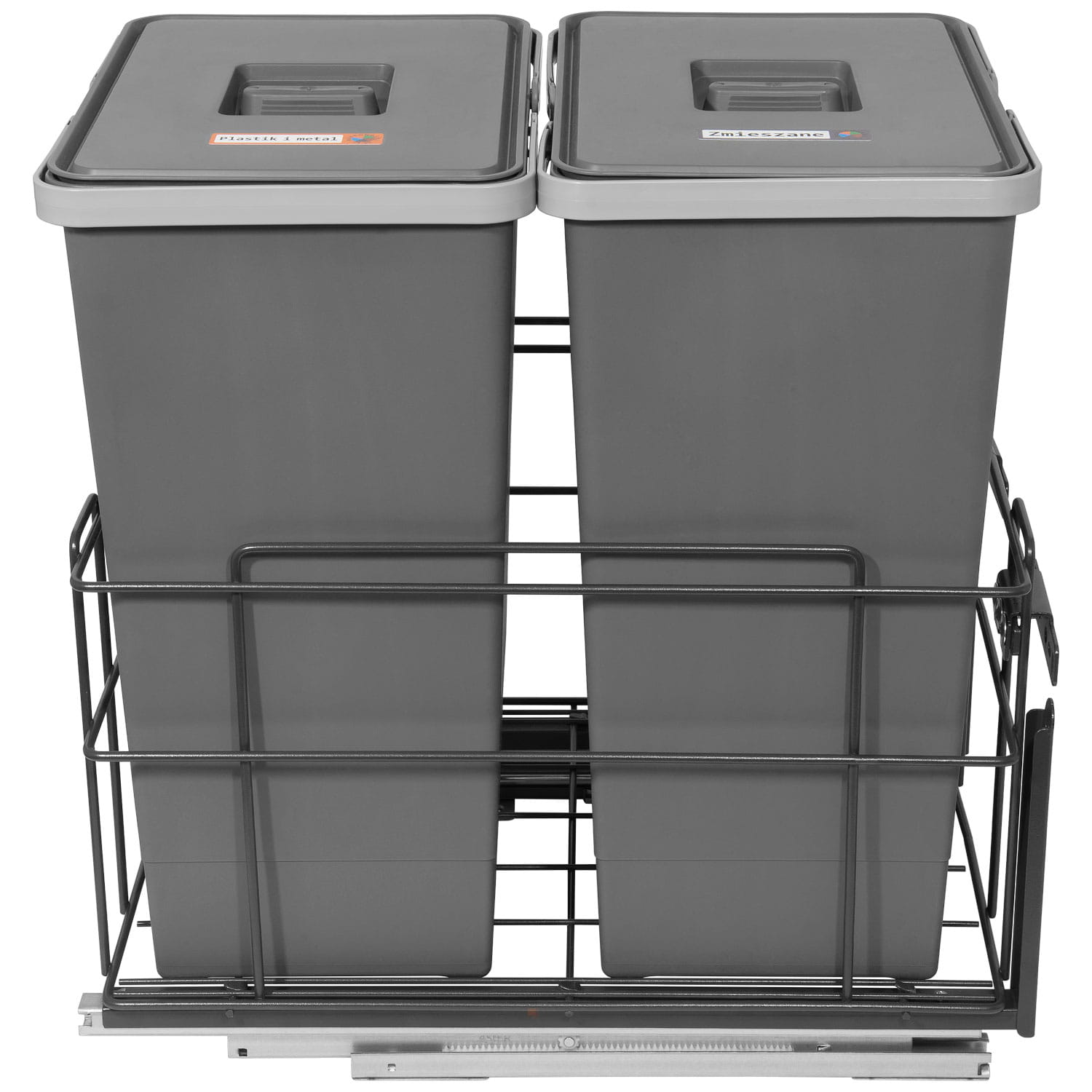 Zestaw składa się z dwóch koszy z pokrywami, stalowego stelaża, wysokiej jakości prowadnic dolnego montażu z funkcją pełnego wysuwu i cichego domyku oraz kompletu mocowań.