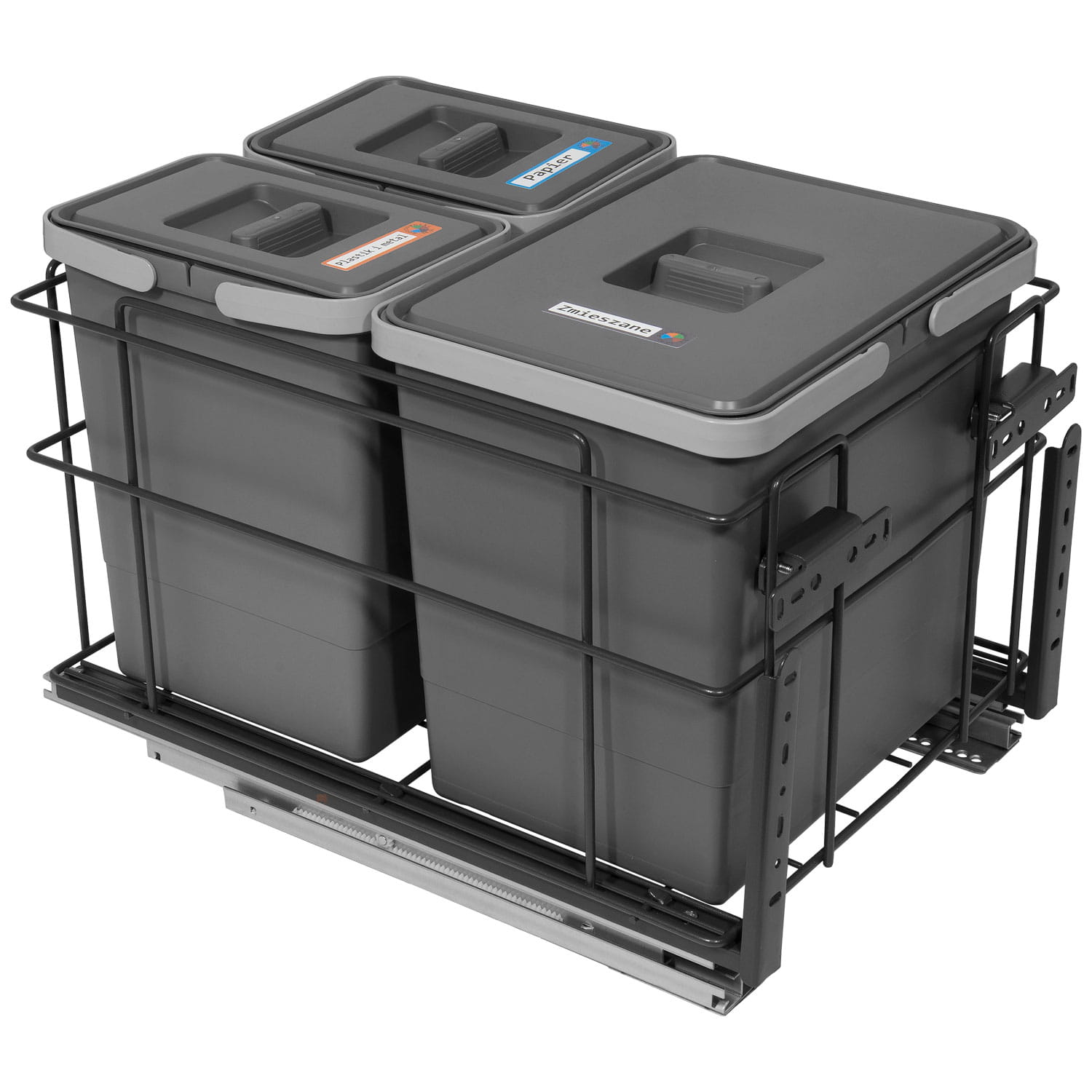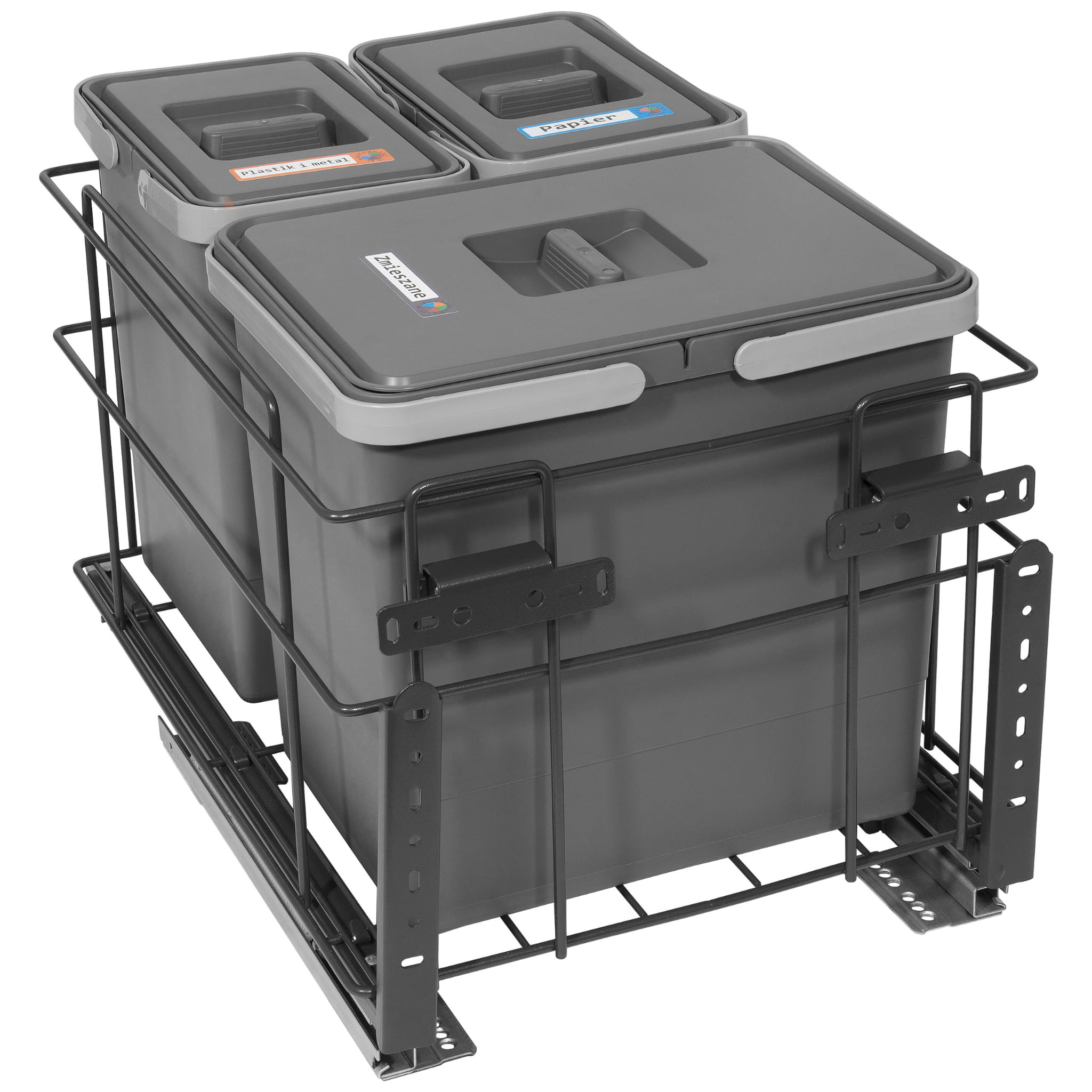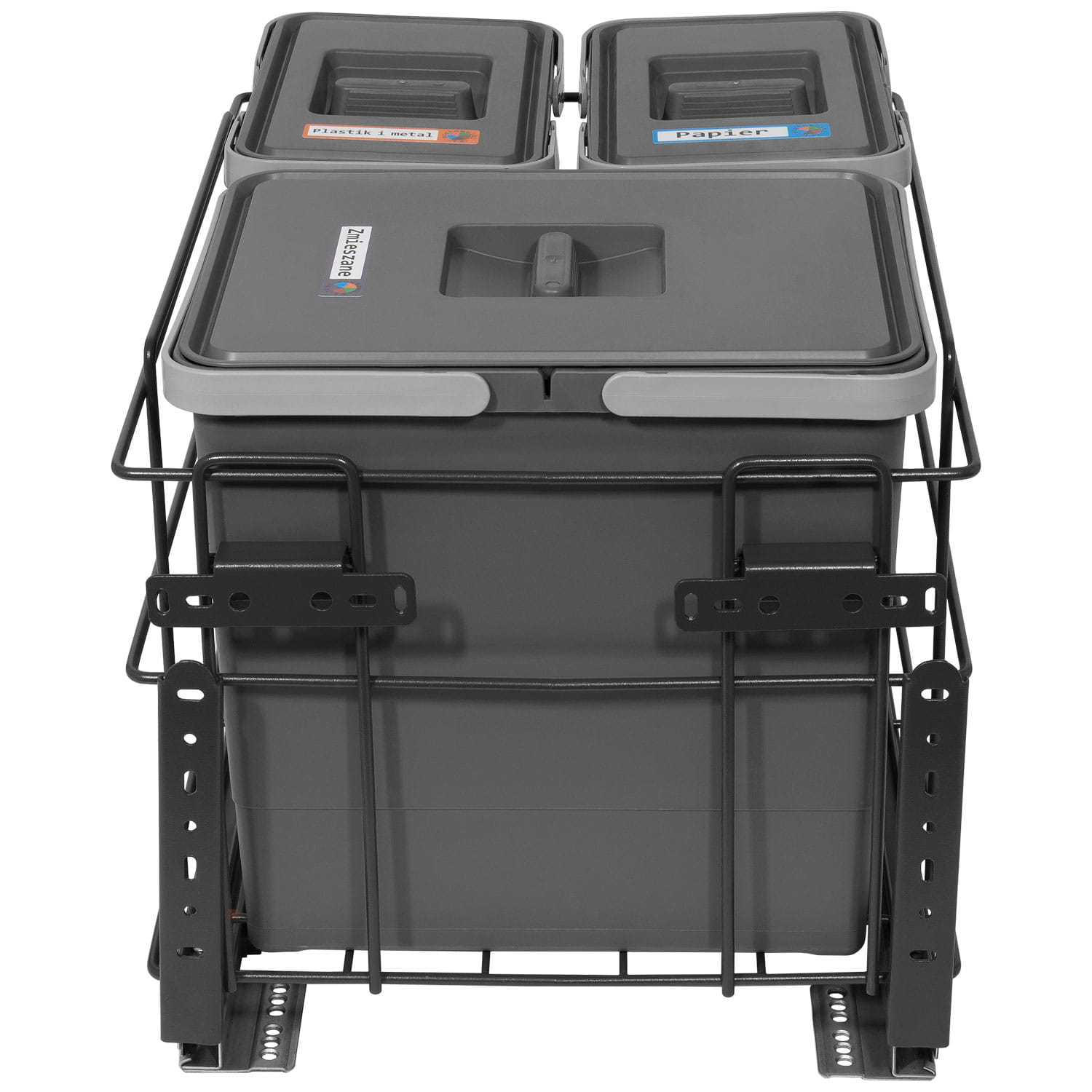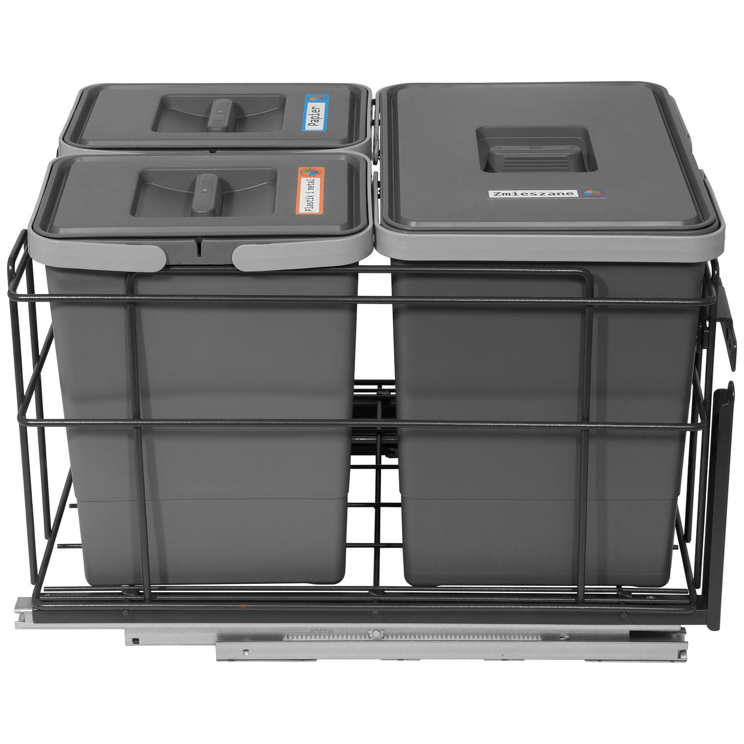 Zestaw składa się z trzech koszy z pokrywami, stalowego stelaża, wysokiej jakości prowadnic dolnego montażu z funkcją pełnego wysuwu i cichego domyku oraz kompletu mocowań.