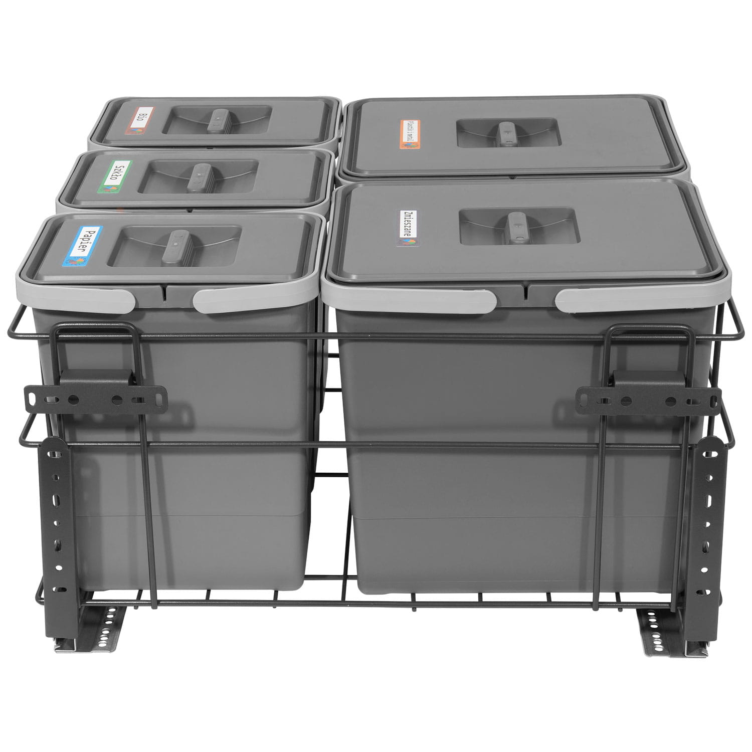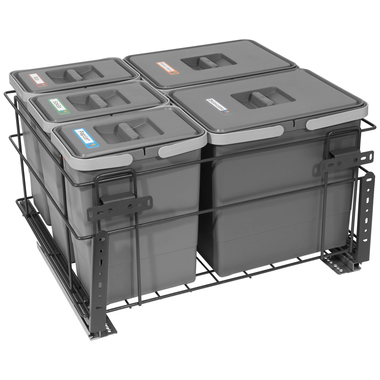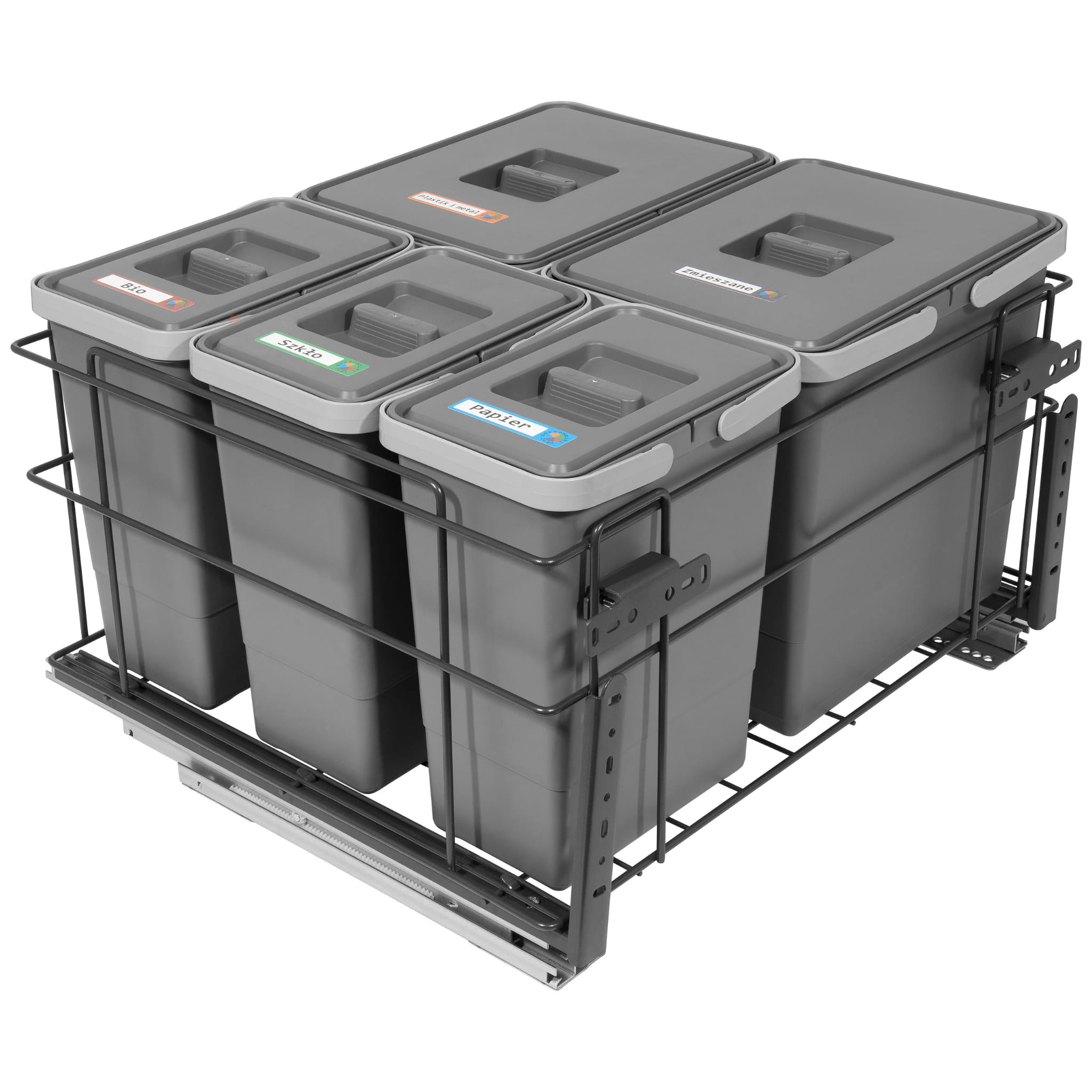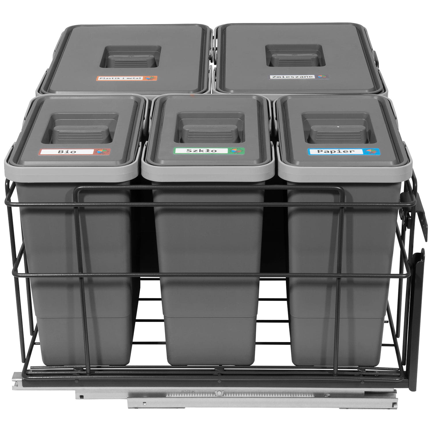 Zestaw składa się z pięciu koszy z pokrywami, stalowego stelaża, wysokiej jakości prowadnic dolnego montażu z funkcją pełnego wysuwu i cichego domyku oraz kompletu mocowań.