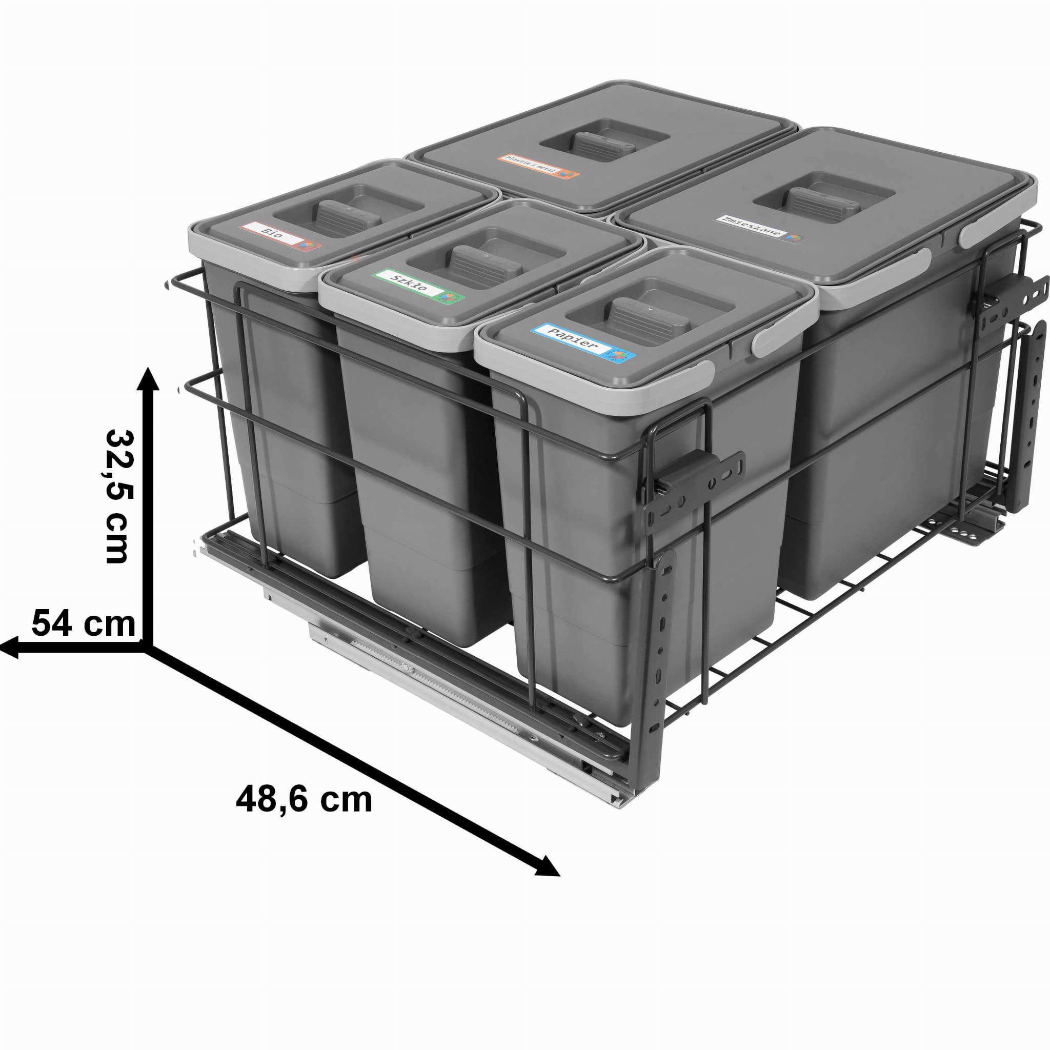 Sortownik śmieci z mocowaniem frontu meblowego SQUARE ANTRACYT do szafki 60 cm Cichy domyk 2x15l + 3x7 l to funkcjonalny produkt polskiej marki dedykowany szafkom kuchennym o szerokości 60 cm z wysuwanym frontem. Produkt posiada dużą pojemność sumaryczną wynoszącą 51 litrów.