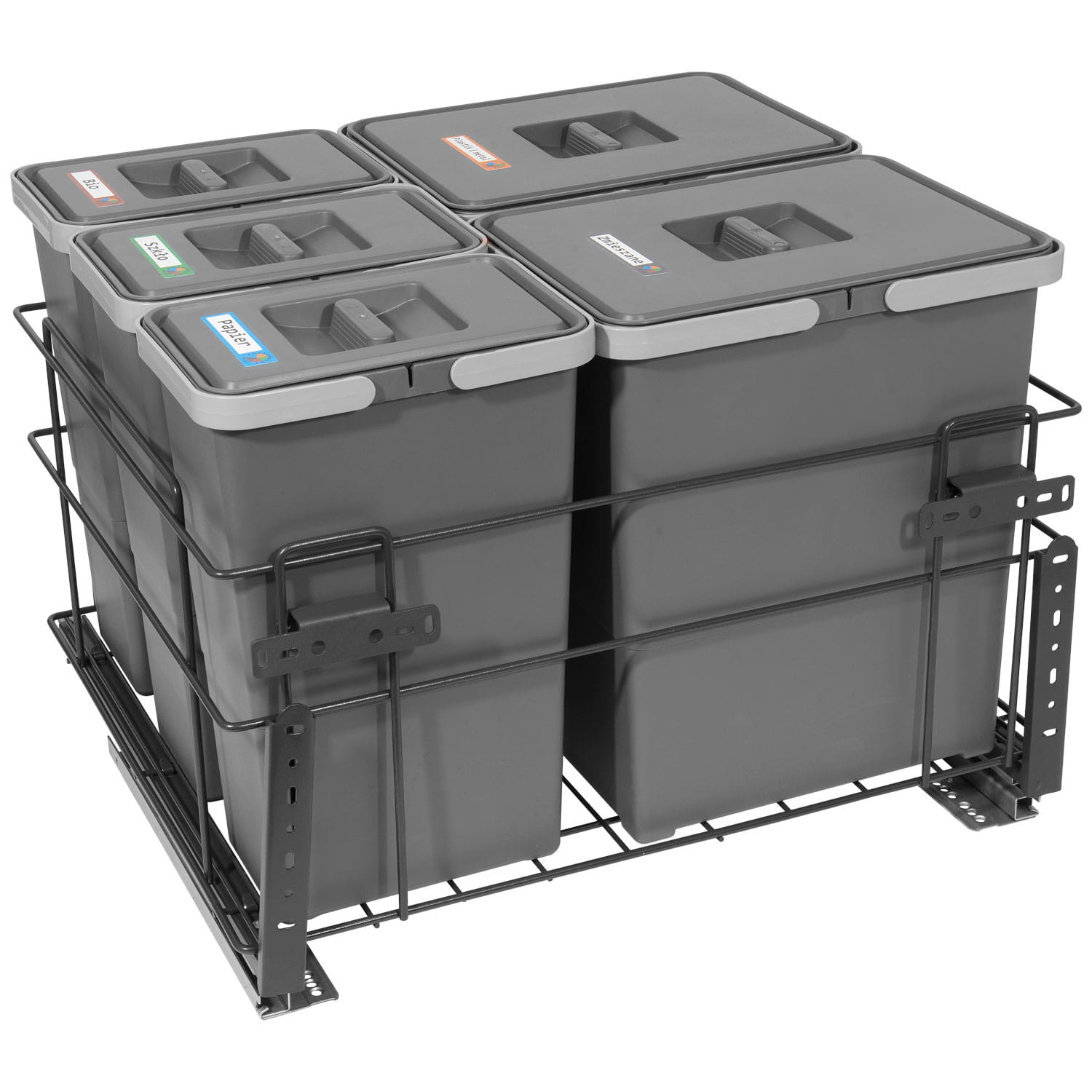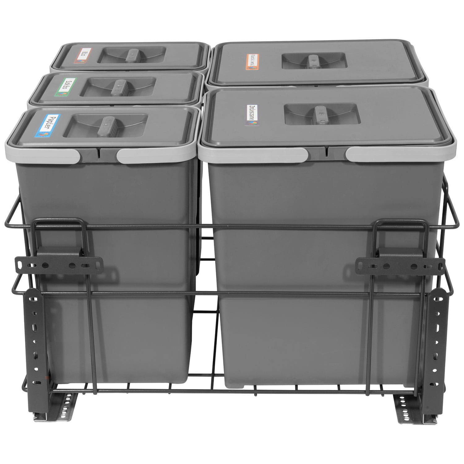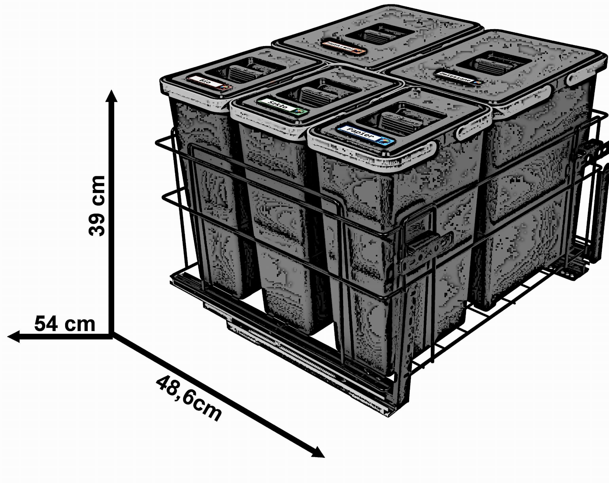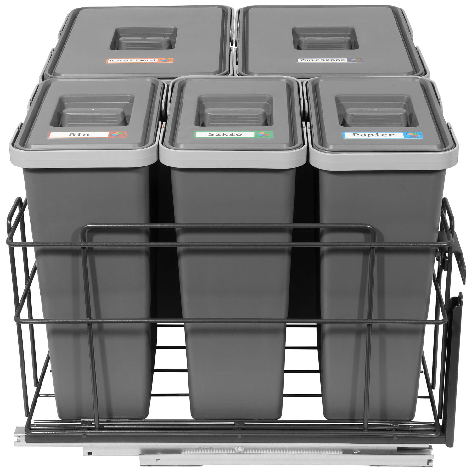 Zestaw składa się z pieciu koszy z pokrywami, stalowego stelaża, wysokiej jakości prowadnic dolnego montażu z funkcją pełnego wysuwu i cichego domyku oraz kompletu mocowań.