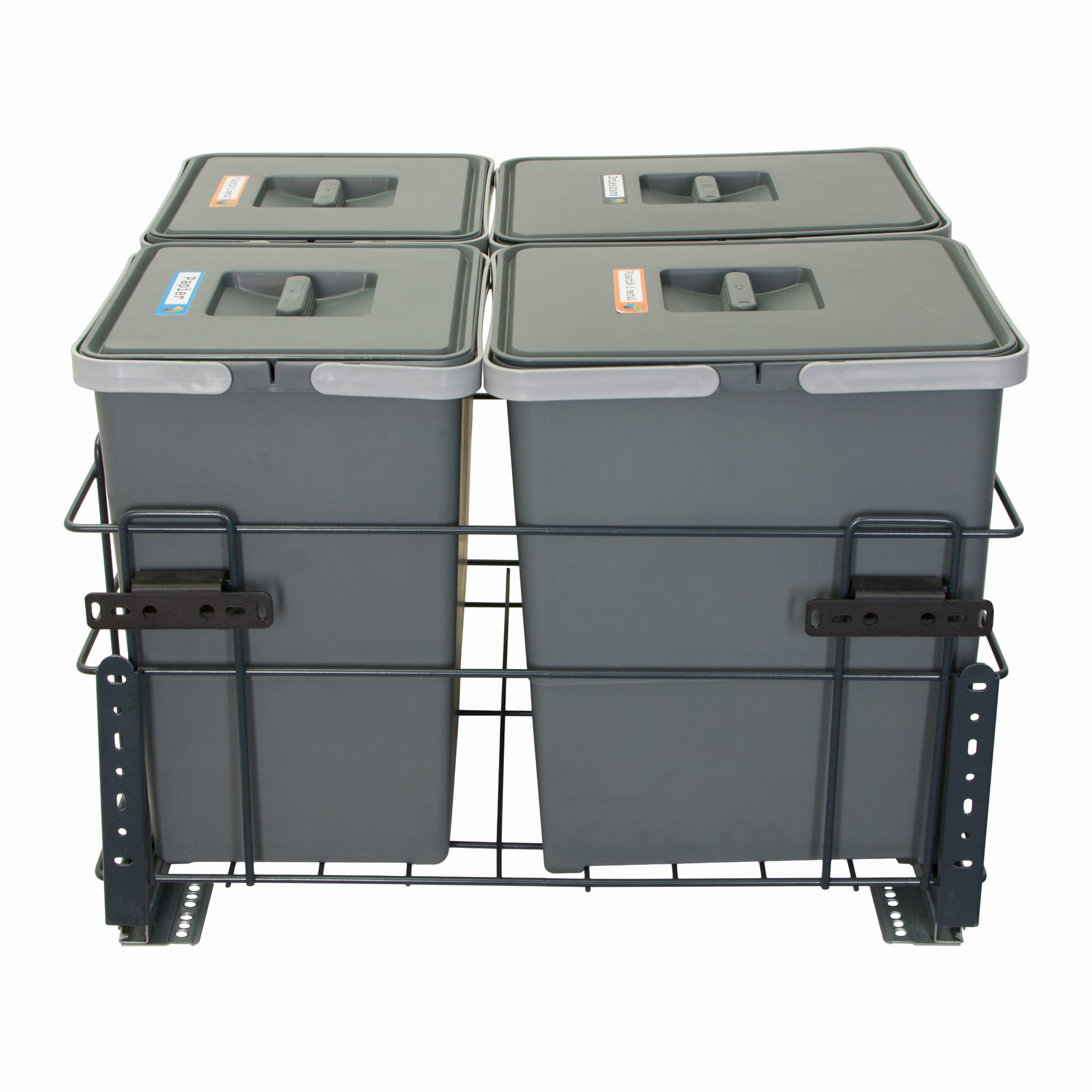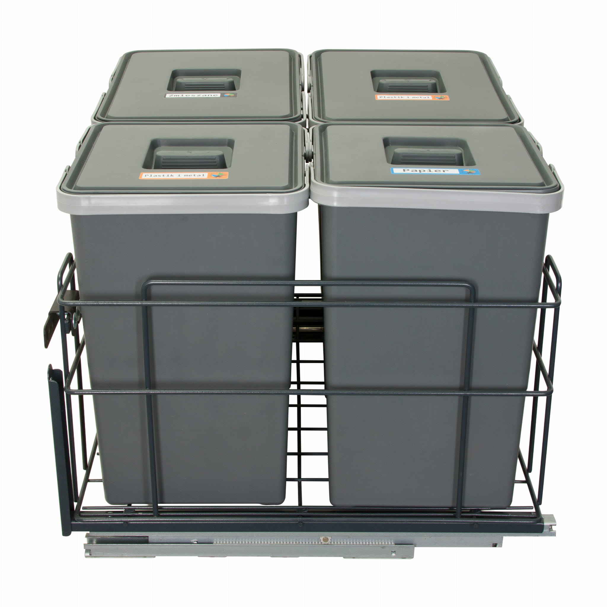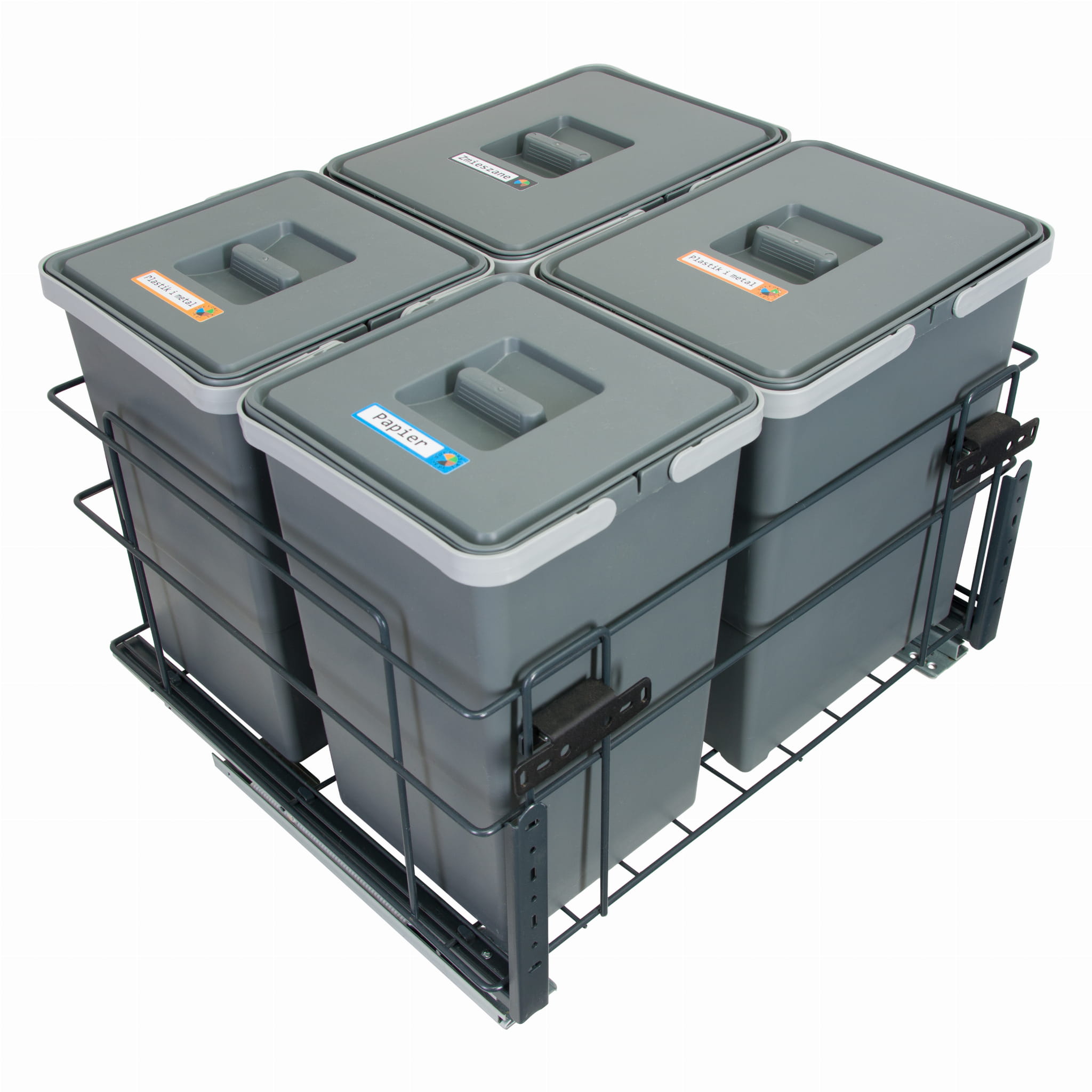 Zestaw składa się z czterech koszy z pokrywami, stalowego stelaża, wysokiej jakości prowadnic dolnego montażu z funkcją pełnego wysuwu i cichego domyku oraz kompletu mocowań.