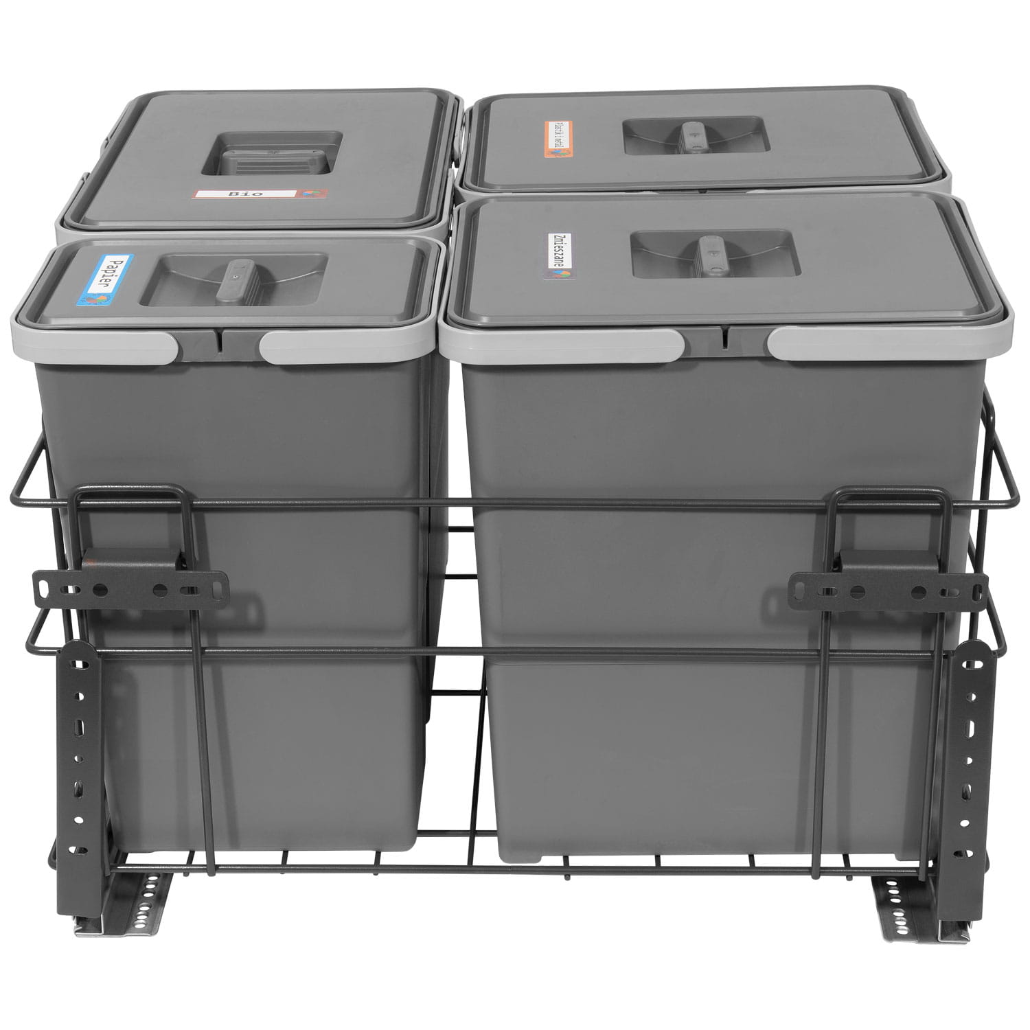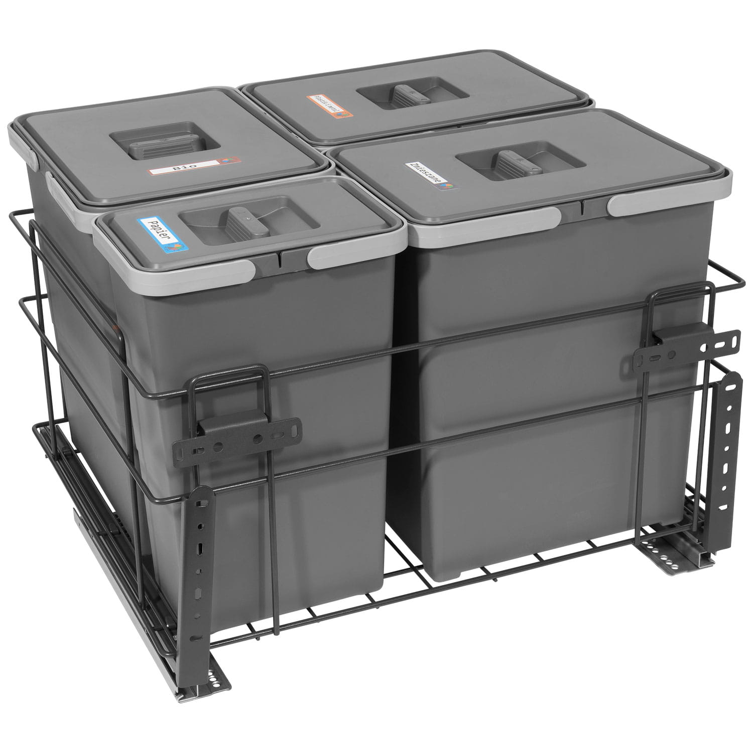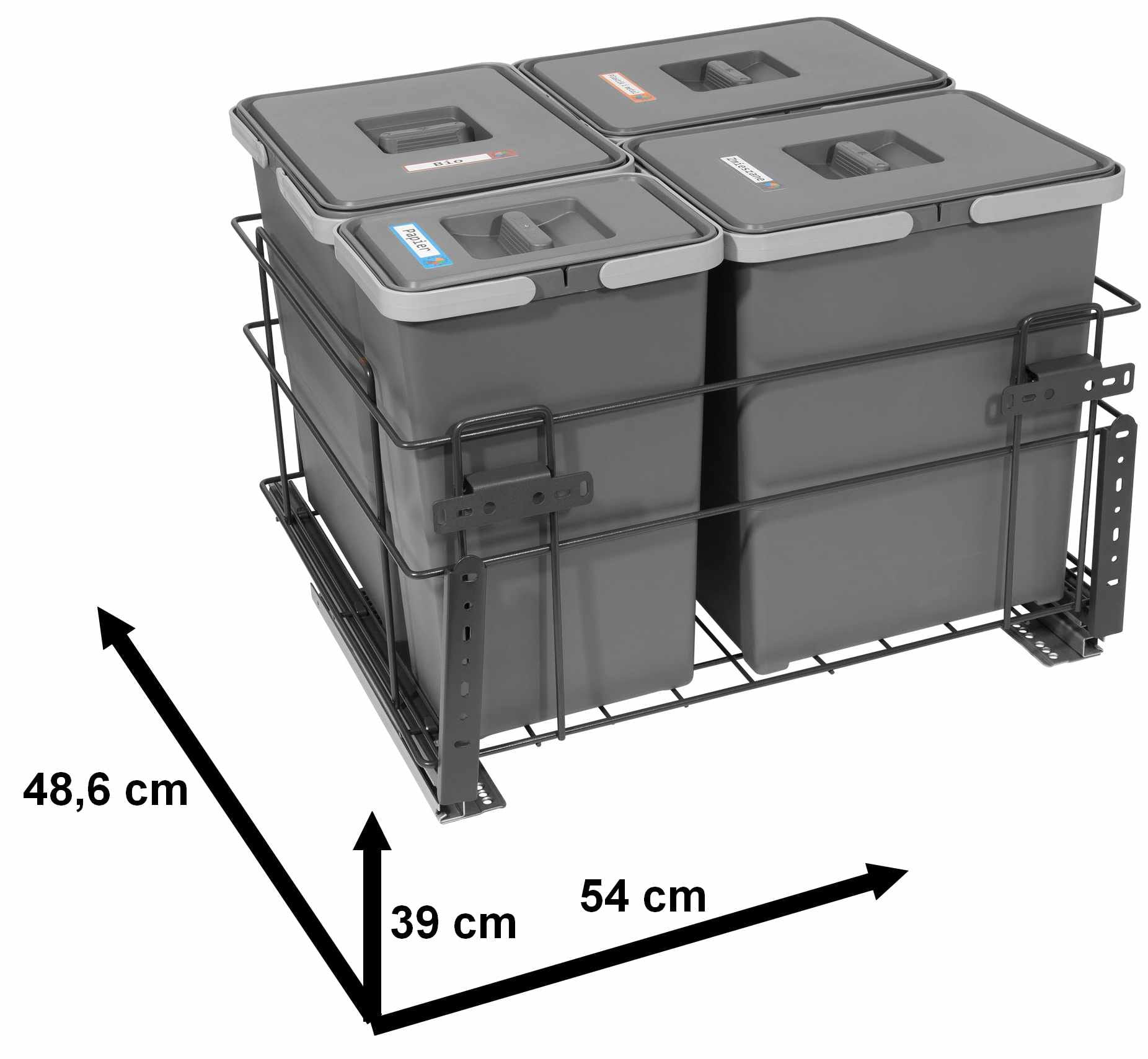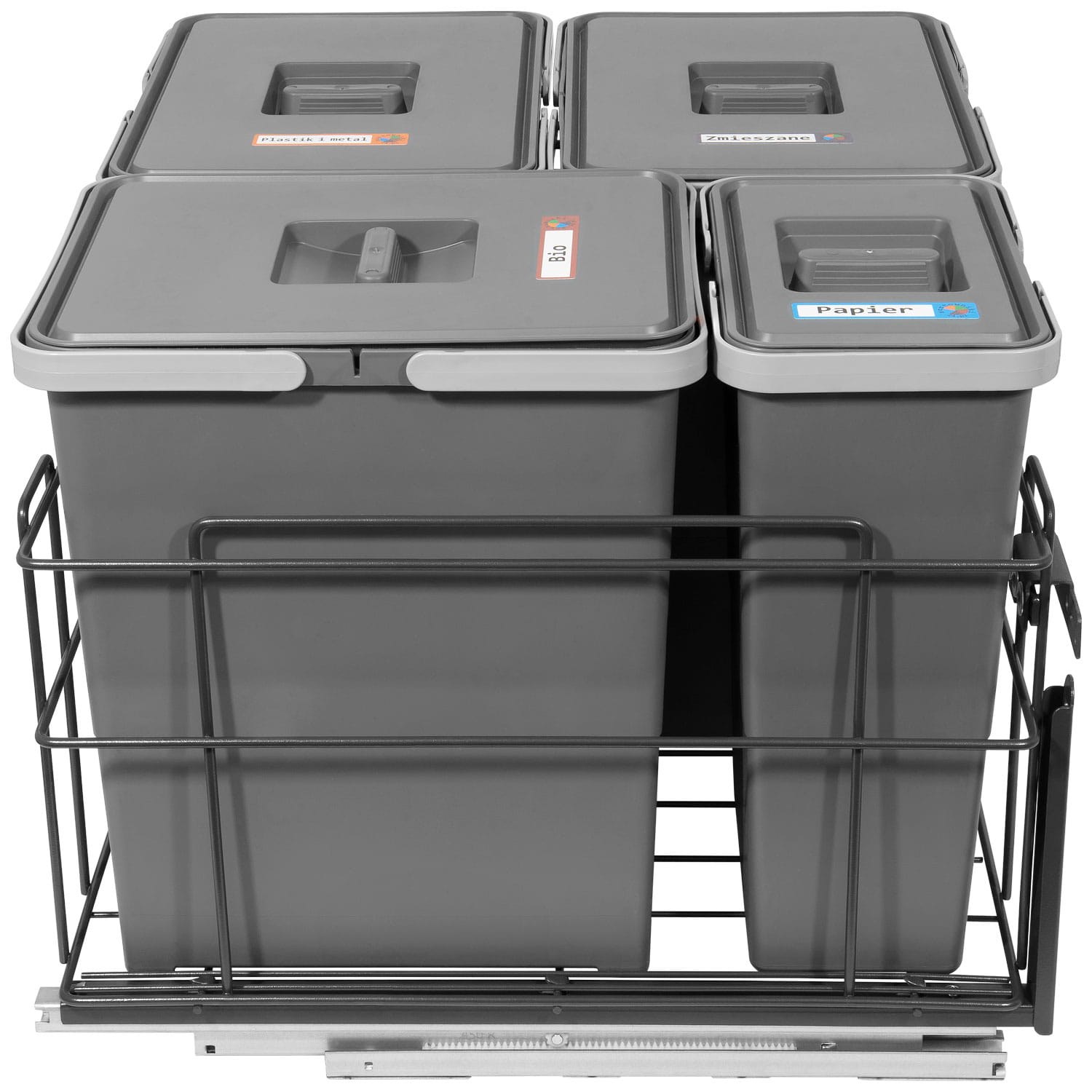 Zestaw składa się z czterech koszy z pokrywami, stalowego stelaża, wysokiej jakości prowadnic dolnego montażu z funkcją pełnego wysuwu i cichego domyku oraz kompletu mocowań.